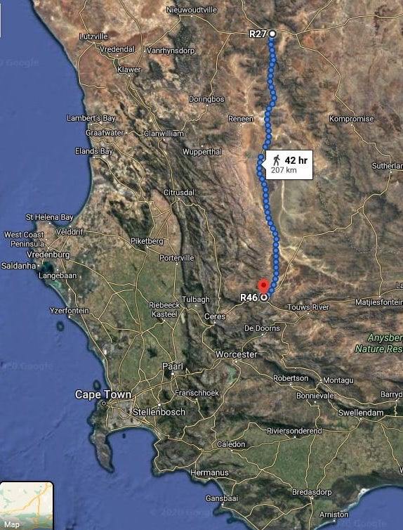 Once at the top Nicky and Henk kept blazing the trail with Marius following. It quickly became very clear that all three of them were running way ahead of schedule. After sunset Marius started gaining some ground and finally caught up with Nicky and Henk at the turn-off onto the R355 from the R27. All three runners completing the 122 km tar road section in times that will be good enough for a Comrades finish.